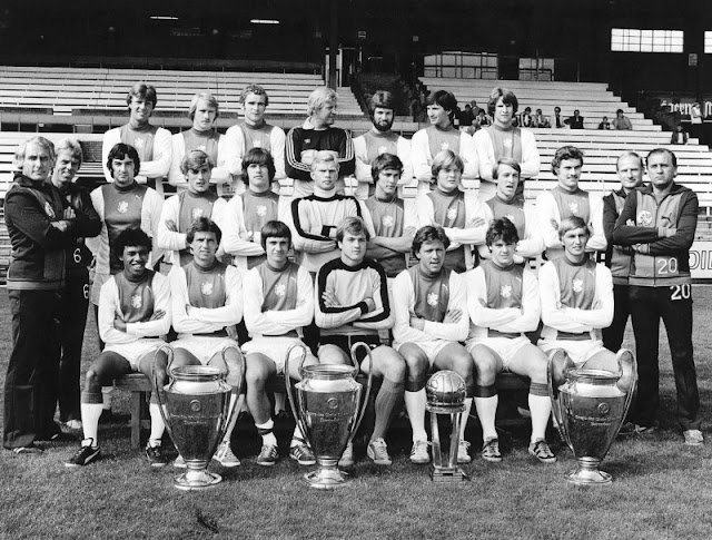 De selectie van Ajax voor het seizoen 1978-1979. Caption: Achterste rij vlnr: Krol, Schoemaker, Cramla, Schrijvers, Errens, Ling en van Dord. Caption: Middelste rij vlnr: Brom (trainer), Beenhakker (trainer), Clarke, Wijnberg, Arnesen, Jager, v.d. Brink, Lerby, Zuidema, Verkaik, Wolf (verzorger) en Haarms (trainer). Caption: Voorste rij zittend vlnr: Tahamata, Everse, Kaiser, Tervoort, Meyer, Lamain, en Meutstege.